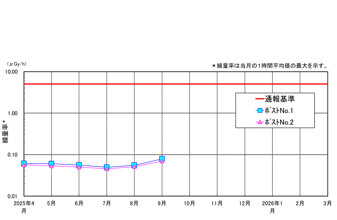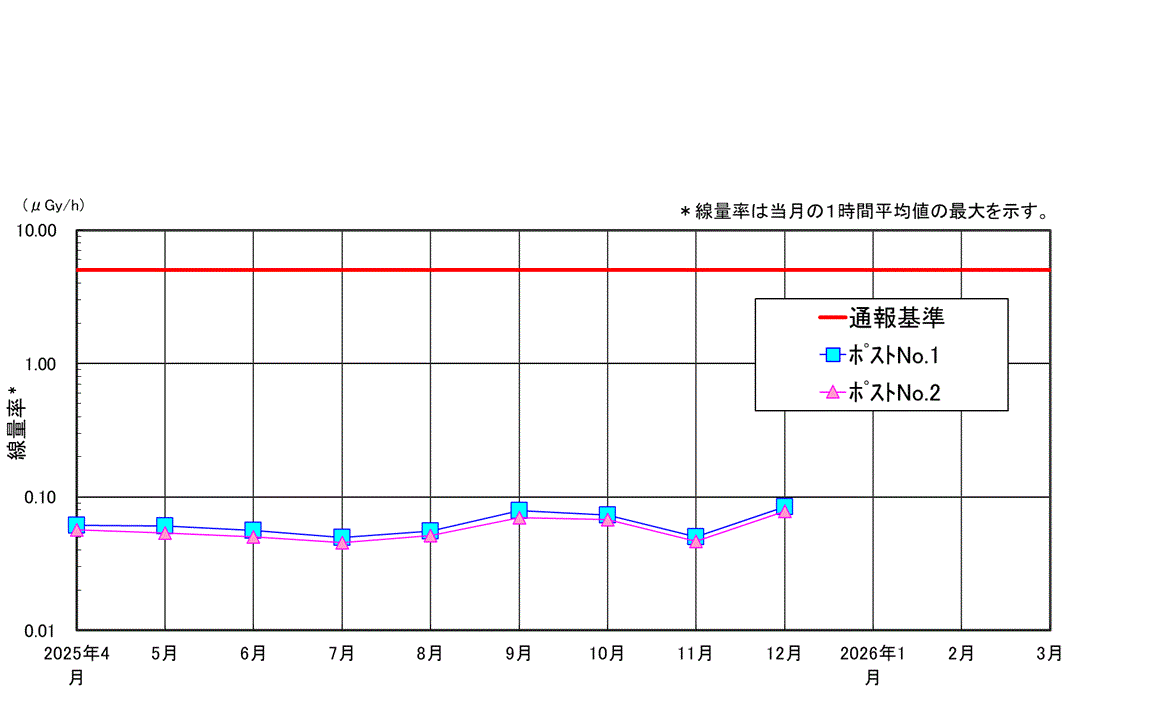 | 当社では原子力災害対策特別措置法に基づき、当社敷地境界付近においてガンマ線量率の連続測定を行なっています。 原子力災害対策特別措置法に基づく通報基準 1台のモニタリングポストの測定値が5μSv/h以上を示した場合、原子力防災管理者は内閣総理大臣、原子力規制委員会、知事、市町村長および他の関係機関へ通報を行う。 |