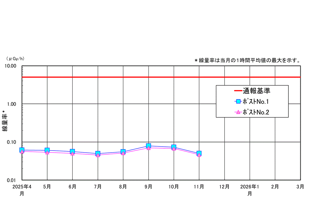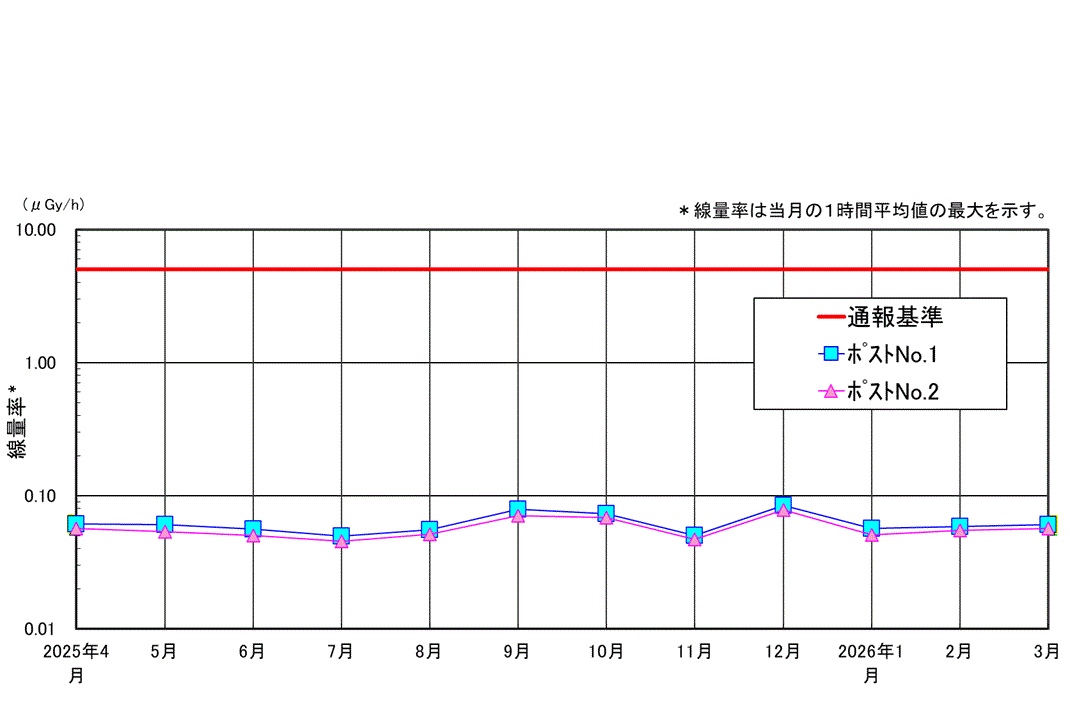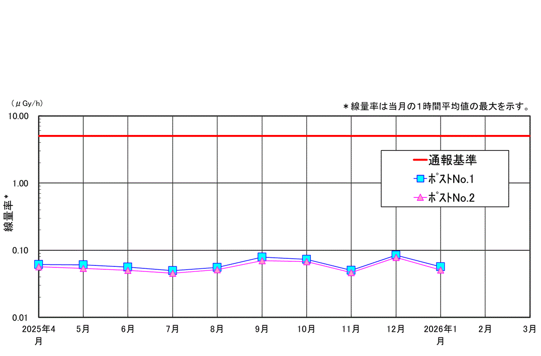 | 当社では原子力災害対策特別措置法に基づき、当社敷地境界付近においてガンマ線量率の連続測定を行なっています。 原子力災害対策特別措置法に基づく通報基準 1台のモニタリングポストの測定値が5μSv/h以上を示した場合、原子力防災管理者は内閣総理大臣、原子力規制委員会、知事、市町村長および他の関係機関へ通報を行う。 |